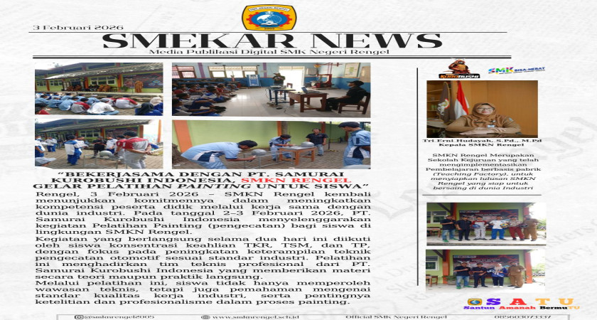 Rengel, 3 Februari 2026 – SMKN Rengel kembali menunjukkan komitmennya dalam meningkatkan kompetensi peserta didik melalui kerja sama dengan dunia industri. Pada tanggal 2–3 Februari 2026, PT. Samurai Kurobushi Indonesia menyelenggarakan kegiatan Pelatihan Painting (pengecatan) bagi siswa di lingkungan SMKN Rengel.